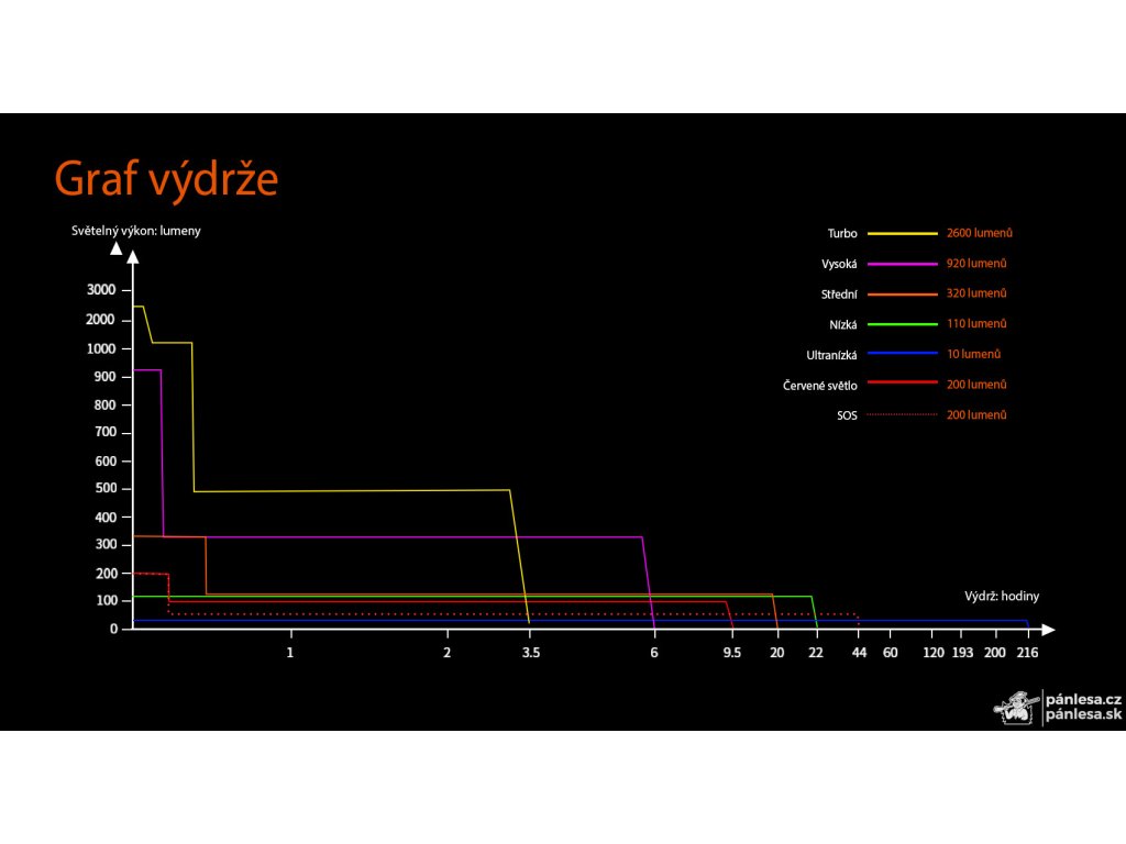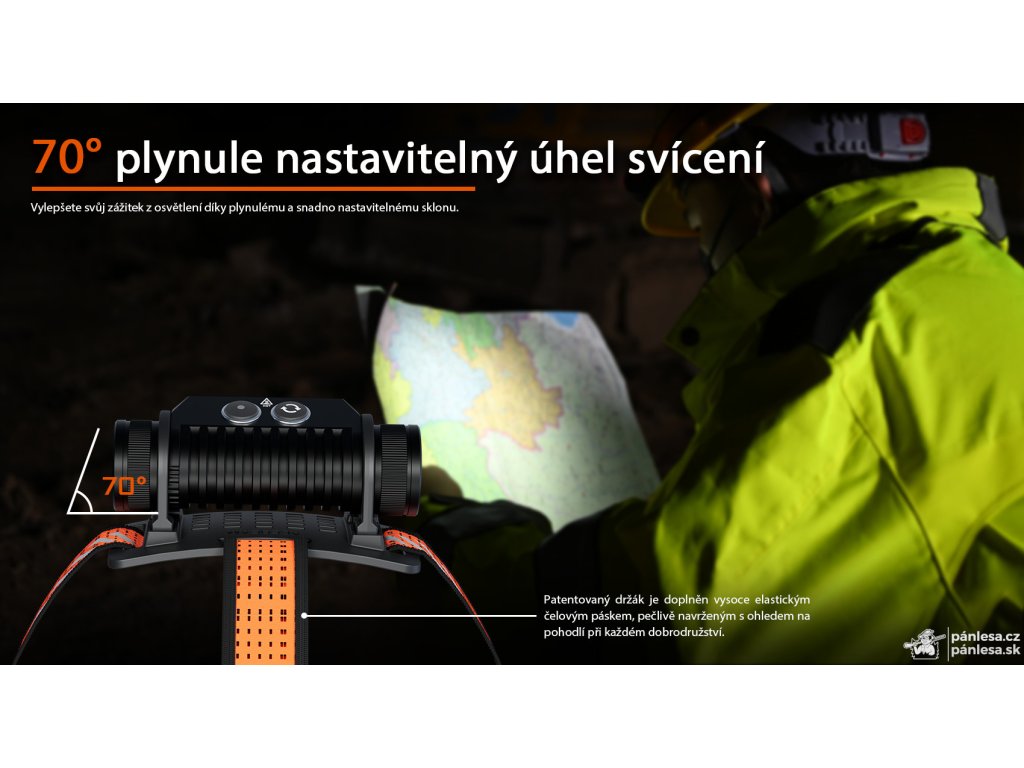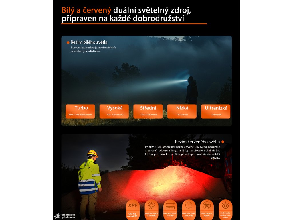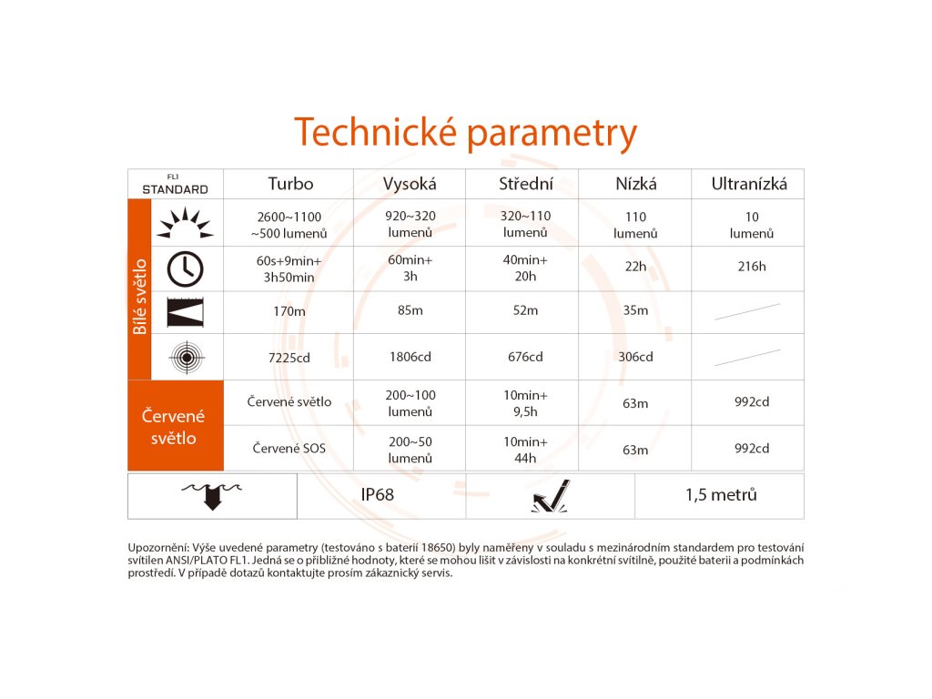 - 4x LED dioda LUXEON HL4X 6500K a 1x Red CREE LED - Světelný tok 2600 lm - Chromatičnost 6500K (studená bílá) - Jas 7225 nt - Dosvit 170 m - 7 režimů osvětlení (Ultra-nízká, nízká, střední, vysoká, turbo, červená a červená SOS) - Digitálně regulovaný okruh pro konstantní jas - Hmotnost 163 g (s baterií) - Odolnost IP68 (ponor do hloubky dvou metrů) - Odolnost proti pádu z výšky 1,5 metru - Napájení pomocí 1x 18650 baterie - Indikátor nízkého stavu baterie - Skrytý USB-C port pro nabíjení - Tělo vyrobeno ze slitiny hliníku s povrchovou úpravou HAIII, která vyniká odolností proti mechanickému poškození - Tvrzená ultra čirá skleněná čočka s antireflexní úpravou - Krytka baterie disponuje velmi silným magnetem, který lze použít pro připevnění svítilny ke kovovému povrchu - Nastavitelný popruh na hlavu nese držák na svítilnu, který umožňuje náklon v širokém rozsahu - Černá barva - Oranžový popruh s reflexními prvky