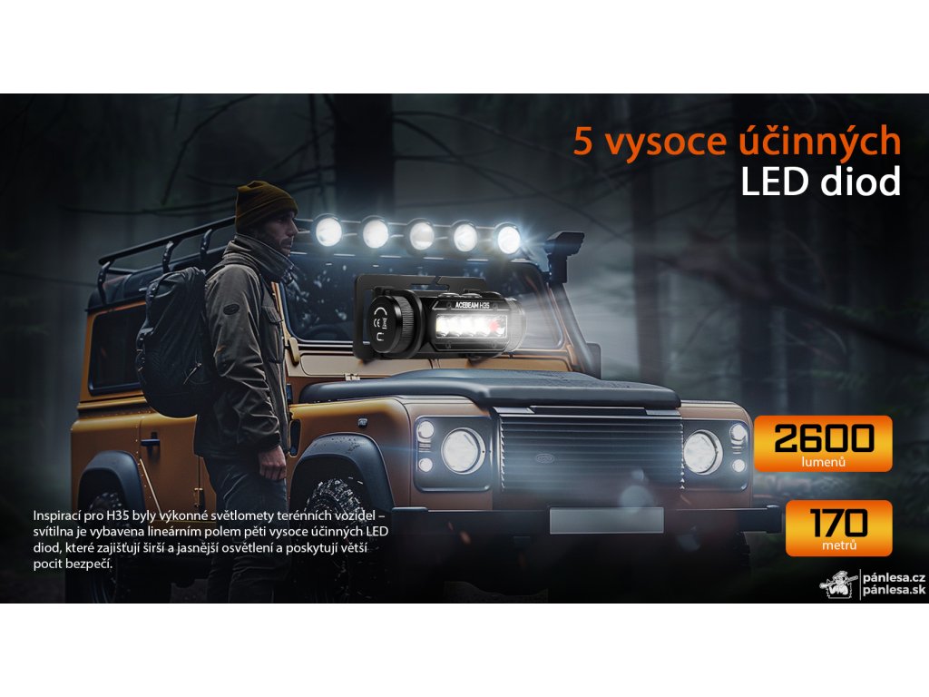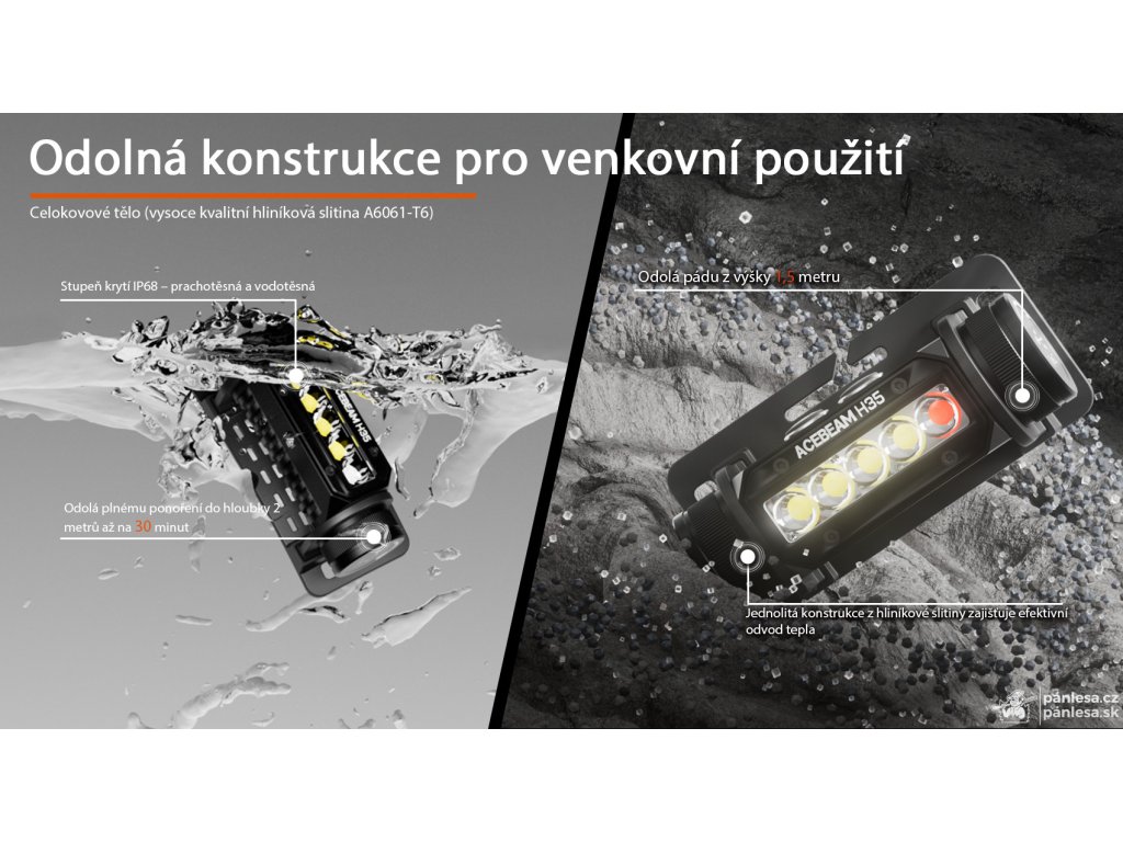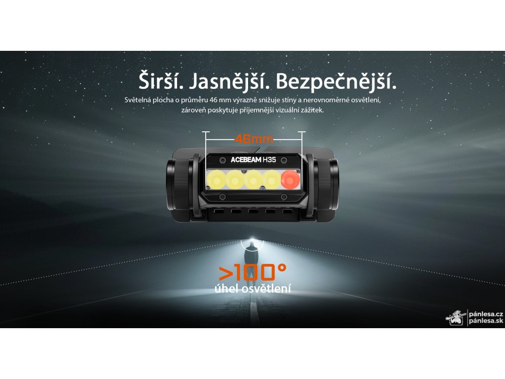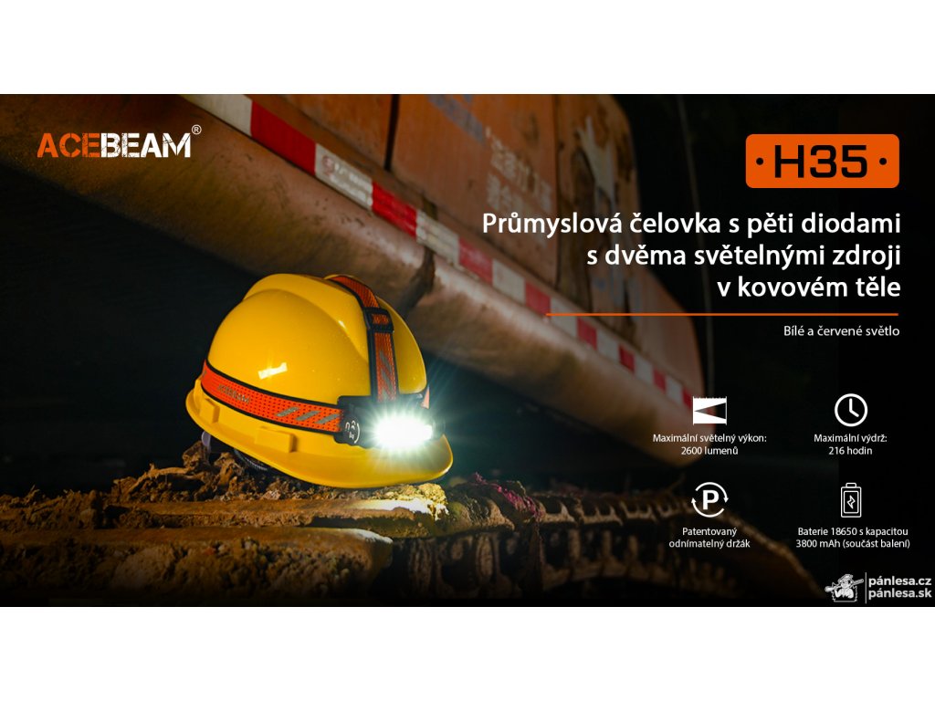 Čelovka AceBeam H35 se silně inspirovala řadou výkonných reflektorů na terénních vozidlech, a proto pro svícení neslouží jedna LED dioda, ale celkem pět LED diod v jedné řadě. Pro osvětlení standardním bílým světlem byly vybrány čtyři LED diody LUXEON HL4X 6500K a pátá LED dioda Red CREE LED se stará o osvětlení v červené barvě. Při zapojení čtyř diod dokáže čelovka vyvinout světelný tok až 2600 lumenů, jas až 7225 nitů a celkový dosvit činí 170 metrů. Při svícení červenou diodou jsou tyto hodnoty 200 lumenů, 992 nitů a dosvit 63 metrů.