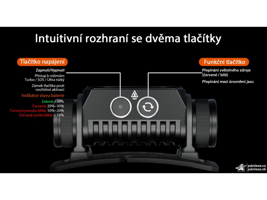 Čelovka se ovládá pomocí dvou tlačítek s intuitivními akcemi. Intenzitu hlavní LED diody lze přepínat mezi pěti režimy - Ultra-nízká, nízká, střední, vysoká, turbo. Červená LED dioda pak přináší další dva režimy, a to je režim svícení červeným světlem a SOS blikání taktéž červeným světlem. Čelovka si navíc po vypnutí pamatuje naposledy zvolenou intenzitu a při opětovném zapnutí se zapne v tomto režimu.
