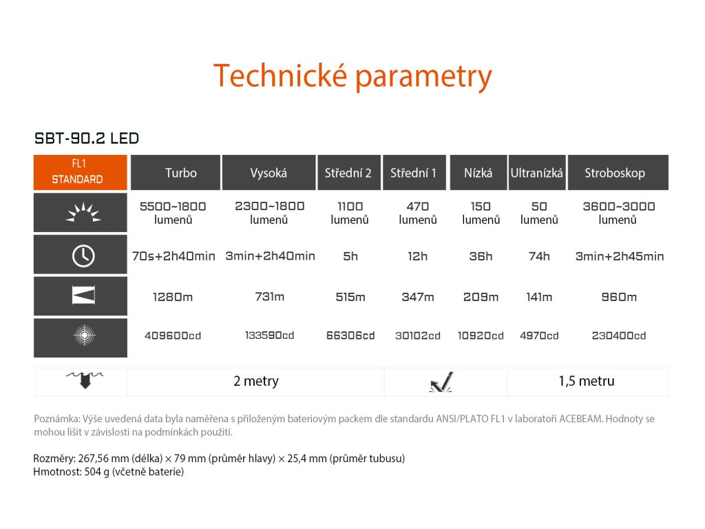 - Dioda 1x Luminus SBT90.2 - Světelný tok 5500 lm - Chromatičnost 5700K (studená bílá) - Jas 409600 nt - Dosvit 1280 m - 7 režimů osvětlení (Ultra-nízký, nízký, střední 1, střední 2, vysoký, turbo a stroboskop) - Boční spínač s indikátorem nabití - Zadní dvoupolohový taktický spínač - Hmotnost 504 g s baterií - Odolnost IP68 (ponor do hloubky dvou metrů) - Odolnost proti pádu z výšky 1,5 metru - Napájení pomocí bateriového bloku dvou baterií 21700, alternativně lze napájet dvěmi separátními bateriemi 21700 - Nabíjení pomocí USB-C portu přímo v bateriovém bloku - Tělo vyrobeno ze slitiny hliníku s povrchovou úpravou HAIII, která vyniká odolností proti nechanickému poškození - Úderný kroužek z nerezové oceli - Žebrování pro lepší odvod tepla - Baterie s dvojí pružinou pro zamezení přerušení napájení při použití úderného kroužku - Černá barva
