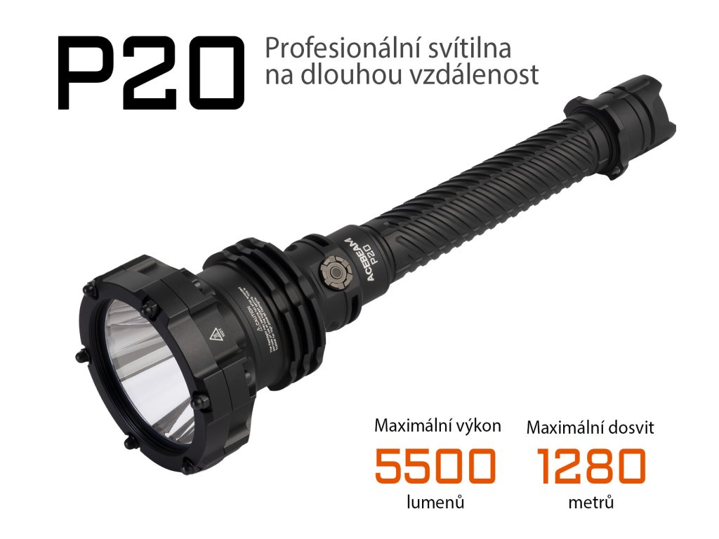 Svítilny řady Defender P vynikají taktickými vlastnostmi, robustností a skvělým zpracováním. Model P20 je vrcholem této řady určené pro náročné situace. P20 disponuje diodou Luminus SBT90.2, která dosahuje hodnoty světelného toku 5500 lumenů, jasu 409600 nitů a dosvit je až 1280 metrů. Intenzitu lze přepínat mezi sedmi režimy: Ultra-nízký, nízký, střední 1, střední 2, vysoký a turbo při které dosahuje hodnoty 5500 lumenů. A jako poslední je zde stroboskopický režim, který lze okamžitě aktivovat zmáčknutím (trvale zapnutý), případně podržením v mezipoloze (zapnutý po dobu stlačení) zadního taktického spínače. Svítilna si navíc po vypnutí pamatuje naposledy zvolenou intenzitu a při opětovném zapnutí se zapne v tomto režimu.