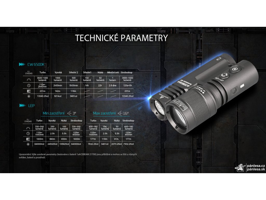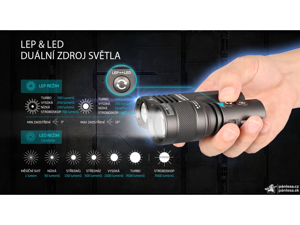 - Dioda 3x LED Floodlight 6500K CW a 1x LEP laserový modul - Světelný tok 3500 lm (v režimu LEP 700 lm) - Chromatičnost 6500K (studená bílá) - Jas 640000 nt - Dosvit 1600 m (v režimu LED 231 m) - 7 režimů osvětlení (Měsíční svit, nízká, střední1, střední 2, vysoká, turbo a stroboskop) - Duální hlava - Možnost ostření laserového světla - Hmotnost 232,2 g bez baterie; s baterií 304,6 g - Odolnost IP68 (ponor do hloubky dvou metrů) - Odolnost proti pádu z výšky 1 metru - Napájení pomocí 1x 21700 - Dobíjení přes USB-C - Indikace stavu baterie - Tělo vyrobeno ze slitiny hliníku s povrchovou úpravou vytvořenou pomocí plazmové elektrolyzické oxidace (MAO) - Tvrzené ultra čisté sklo s antireflexní úpravou - Možnost postavení na spodní hranu a použití svítilny jako svíce - Dva spínače - MAO povrchová úprava utváří světle šedé mramorování